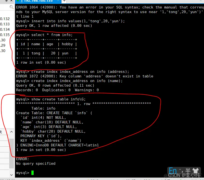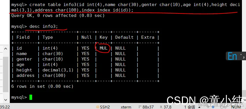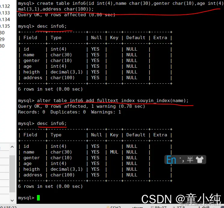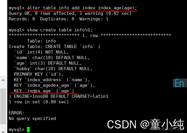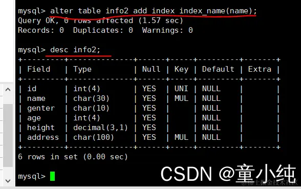 - (列名(length)):length是可选项,下同。如果忽略 length 的值,则使用整个列的值作为索引。如果指定使用列前的 length 个字符来创建索引,这样有利于减小索引文件的大小。