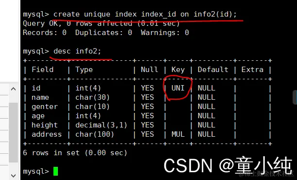 CREATE TABLE 表名 (字段1 数据类型,字段2 数据类型[,...],UNIQUE 索引名 (列名));