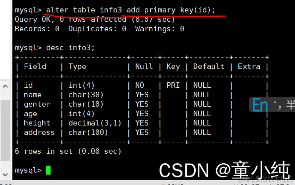 CREATE TABLE 表名 ([...],PRIMARY KEY (列名));