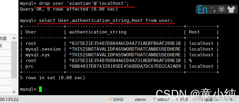 drop user 'xiaotian'@'localhost';