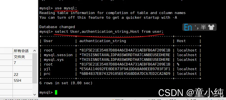 select User,authentication_string,Host from user;