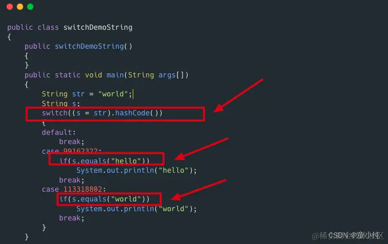 看到这个代码,你知道原来字符串的switch是通过equals()和hashCode()方法来实现的。还好hashCode()方法返回的是int,而不是long。