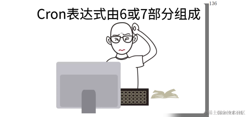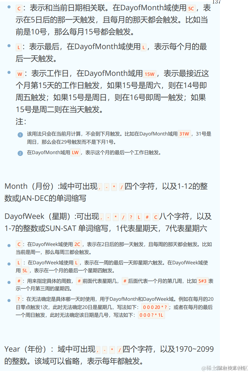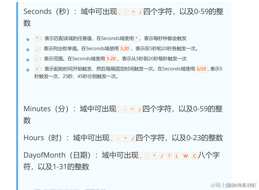 Spring Task依靠Cron表达式配置定时规则。Cron表达式是一个字 符串,分为6或7个域,每一个域代表一个含义,以空格隔开。有如 下两种语法格式: