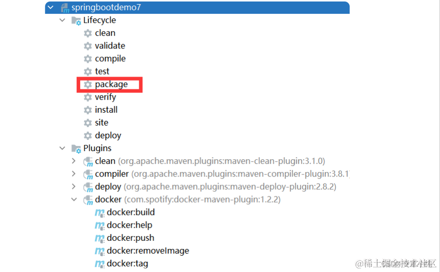 <!-- docker-maven-plugin--> <plugin> <groupId>com.spotify</groupId> <artifactId>docker-mavenplugin</artifactId> <version>1.2.2</version> <configuration> <!-- Docker路径 --> <dockerHost>http://192.168.25.101:2375</dockerHost> <!-- Dockerfile定义 --> <baseImage>openjdk:11</baseImage> <!-- 作者 --> <maintainer>itbaizhan</maintainer> <resources> <resource> <!-- 复制jar包到docker容器指定目录 --> <targetPath>/</targetPath> <!-- 从哪个包拷贝文件,target包 --> <directory>${project.build.directory} </directory> <!-- 拷贝哪个文件 --> <include>${project.build.finalName}.jar</include> </resource> </resources> <workdir>/</workdir> <entryPoint>["java", "-jar","${project.build.finalName}.jar","--spring.profiles.active=dev"]</entryPoint> <forceTags>true</forceTags> <!-- 镜像名 --> <imageName>${project.artifactId} </imageName> <!-- 镜像版本 --> <imageTags> <imageTag>${project.version} </imageTag> </imageTags> </configuration> </plugin>3.使用maven的package命令给项目打包