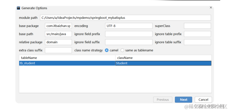 builder.addInclude("tb_student") // 设置需要生成的表名,可以有多个