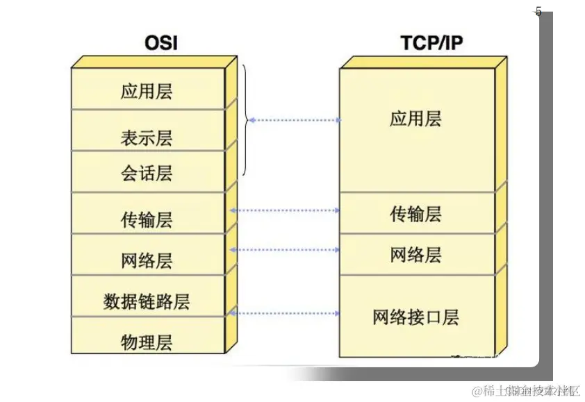 虽然国际标准化组织制定了这样一个网络通信协议的模型,但是实 际上互联网通讯使用最多的网络通信协议是TCP/IP网络通信协议。 TCP/IP 模型,也是按照层次划分,共四层:应用层,传输层,网络 层,网络接口层(物理+数据链路层)。 OSI模型与TCP/IP模型的对应关系: