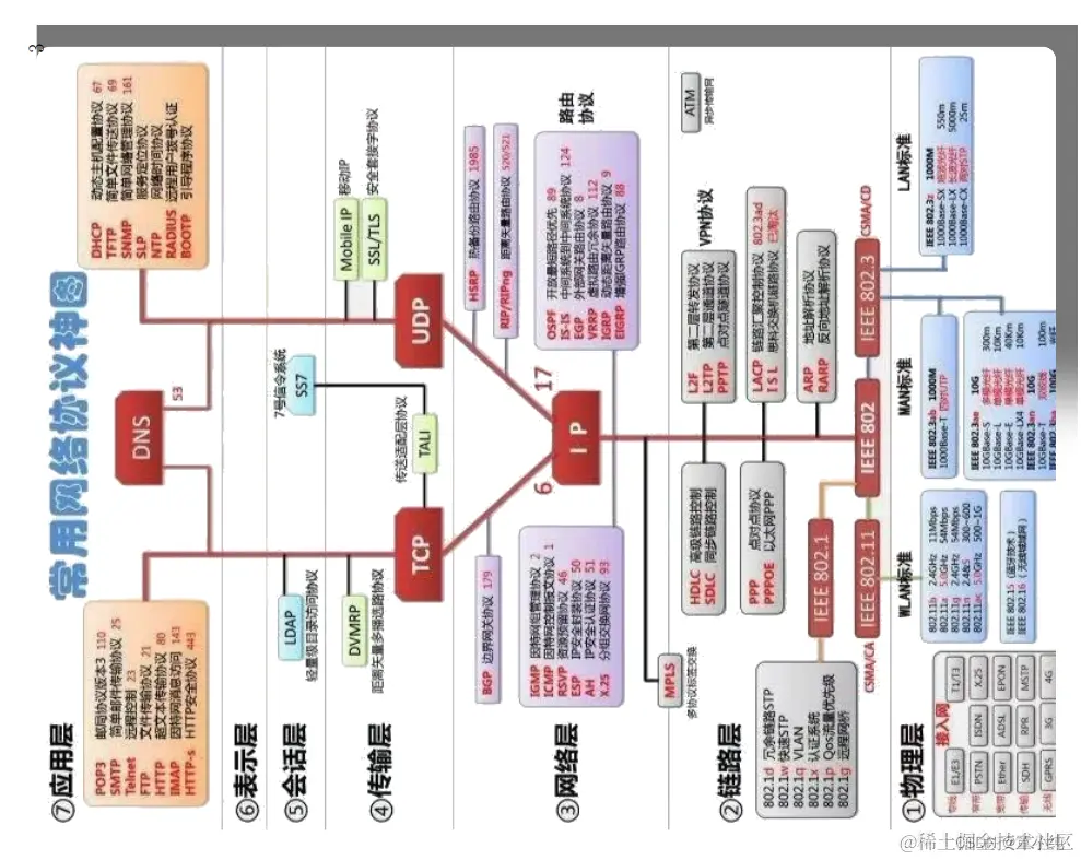 OSI模型制定的七层标准模型,分别是:应用层, 表示层,会话层,传输层,网络层,数据链路层,物理层。