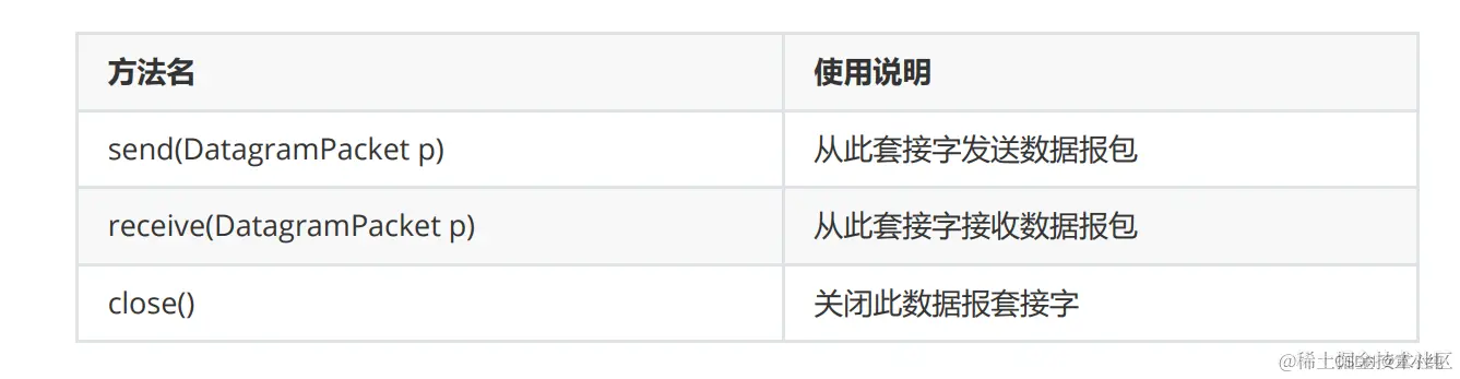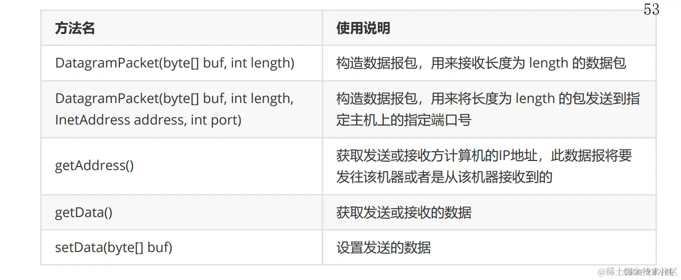 常用方法:构造方法、getAddrress(获取发送或接收方计算机的IP地址)、getData(获取发送 或接收的数据)、setData(设置发送的数据)。