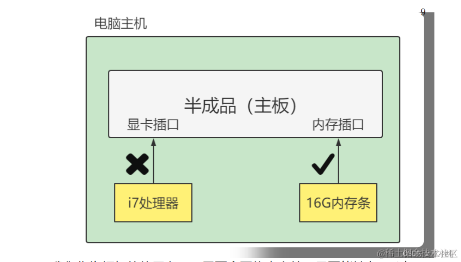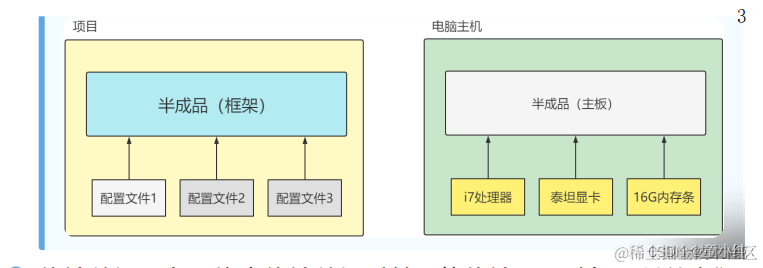 日后编写大型项目,不可能从头到尾都是原创代码,很多功 能前人已经写好,我们只需要使用前人写好的半成品软件 (框架),再加入一些符合我们需求的配置即可完成开发。 比如我们组装一台电脑,不可能自己焊接电路板。而是先买 入一块主板,这块主板就是半成品软件。根据自己的需求加 入一些配置,比如要求流畅运行吃鸡,就需要配置i7处理 器、泰坦显卡。