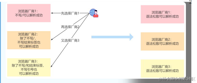 浏览器厂商。最开始W3C制定HTML的时候语法还是比较严格 的。但浏览器厂商为了抢占市场,语法错误也可以解析成功 HTML,最后“内卷”到HTML即使语法非常混乱也是可以被浏览 器解析。