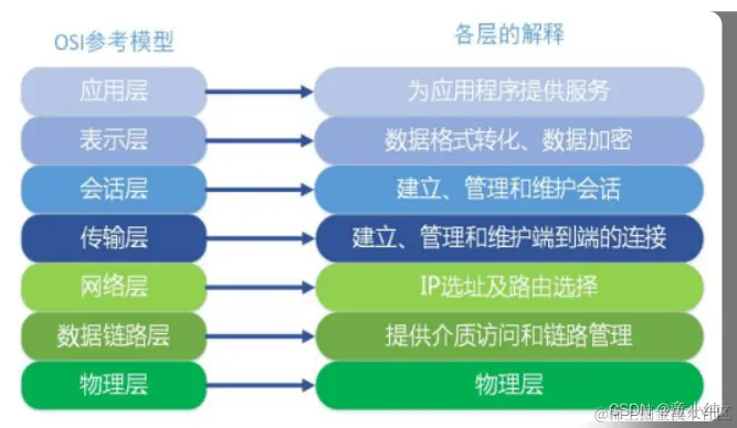 它将计算机网络体系结构的通信协议划分为七层,自下 而上依次为: