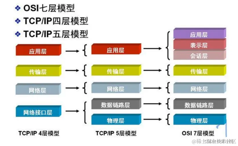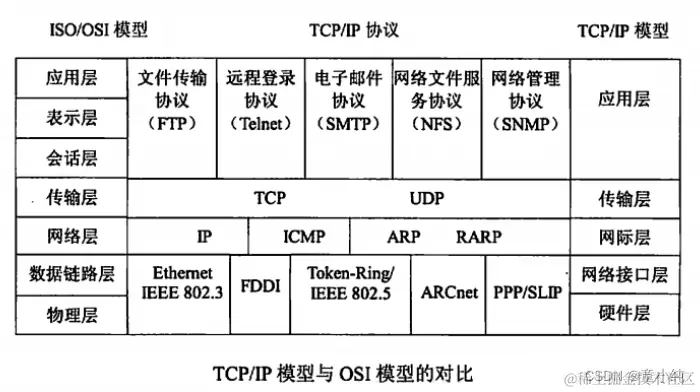 除了标准的OSI七层模型以外,常见的网络层次划分还有TCP/IP四层 协议以及TCP/IP五层协议,它们之间的对应关系如下图所示: