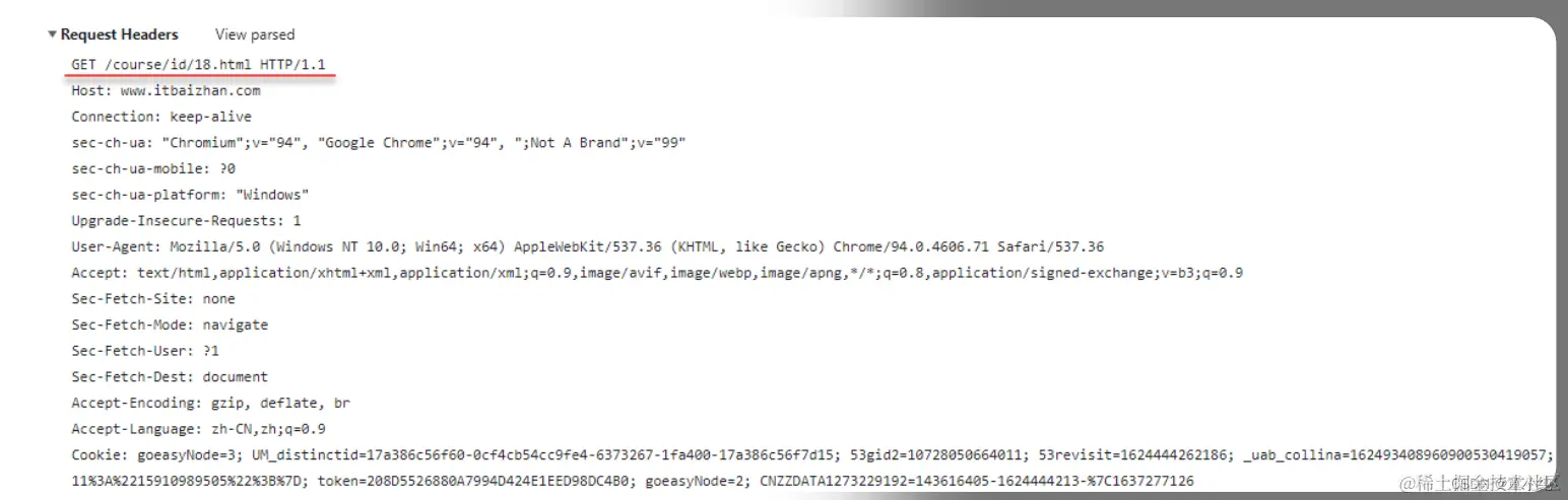 我们以访问:www.itbaizhan.cn/course/id/1… 查看请求状态:
