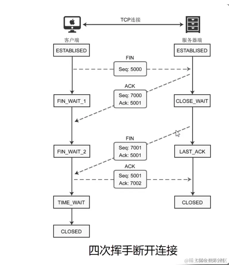 第三次挥手。服务器端数据发送完毕后,向客户端发送FIN包 (seq=w ack=u+1),半连接状态下服务器可能又发送了一些数 据,假设发送 seq 为 w。服务器此时进入了 LAST_ACK状态。