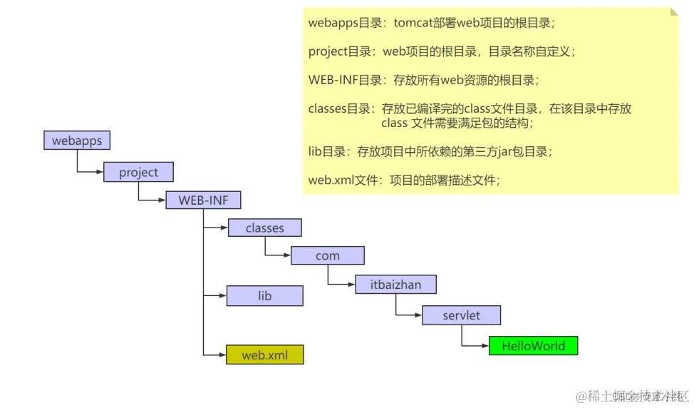webapps目录用来存放应用程序,当tomcat启动时会去加载 webapps目录下的应用程序。可以以文件夹、war包的形式发布应 用。