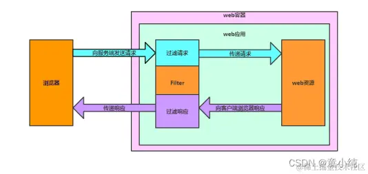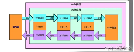 Filter的生命周期是由容器管理的。当容器启动时会实例化Filter并 调用init方法完成初始化动作。当客户端浏览器发送请求时,容器会 启动一个新的线程来处理请求,如果请求的URL能够被过滤器所匹 配,那么则先调用过滤器中 的doFilter方法,再根据是否有 chain.doFilter的指令,决定是否继续请求目标资源。当容器关闭时 会销毁Filter对象,在销毁之前会调用destroy方法。