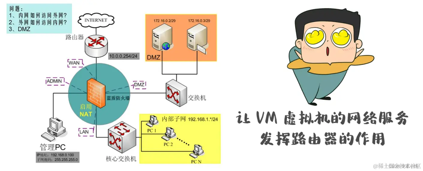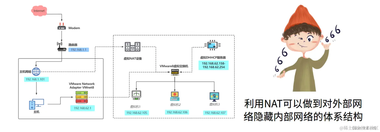 让 VM 虚拟机的网络服务发挥路由器的作用,使得通过虚拟机软件 模拟 的主机可以通过物理主机访问外网,在真机中 NAT 虚拟机网 卡对应的物理网卡是 VMnet8。