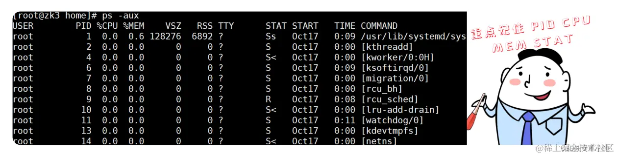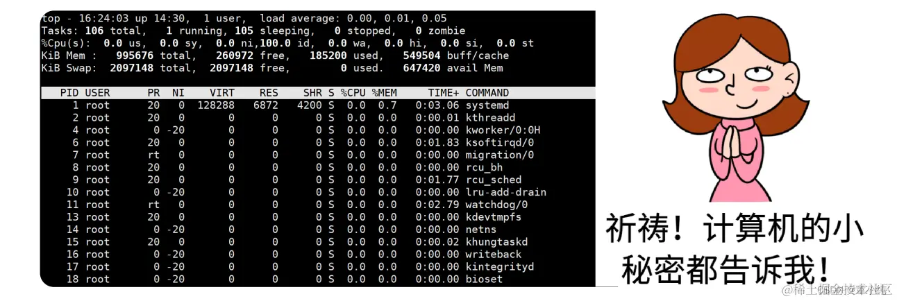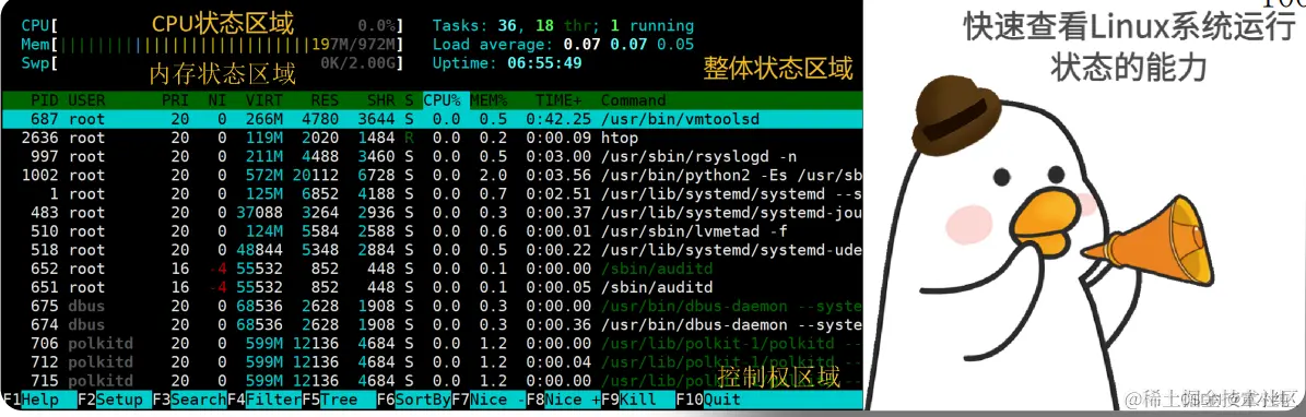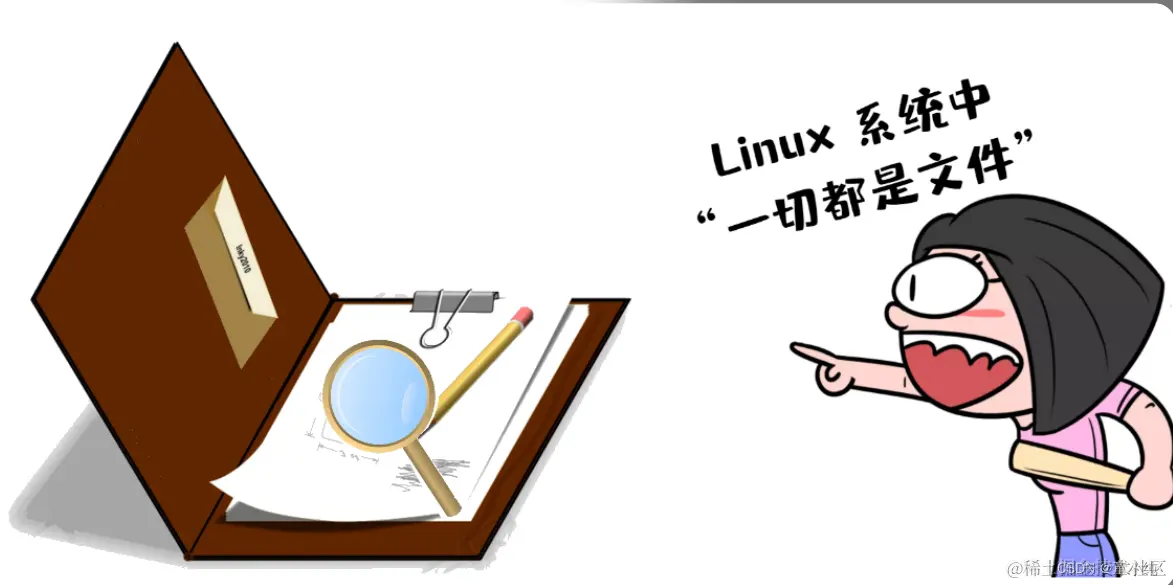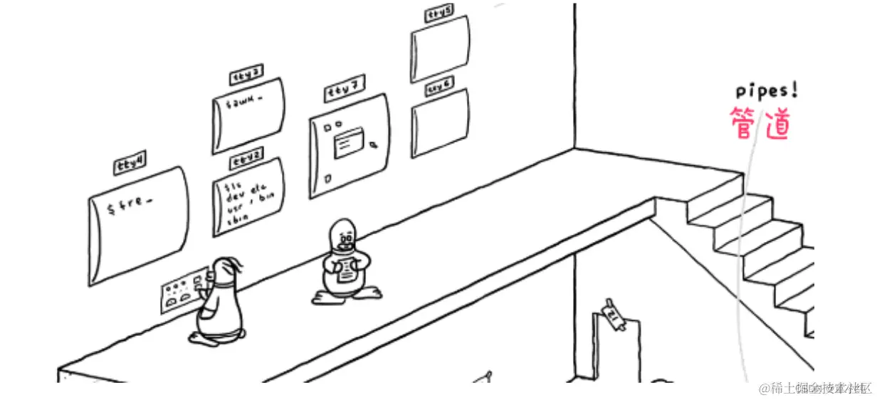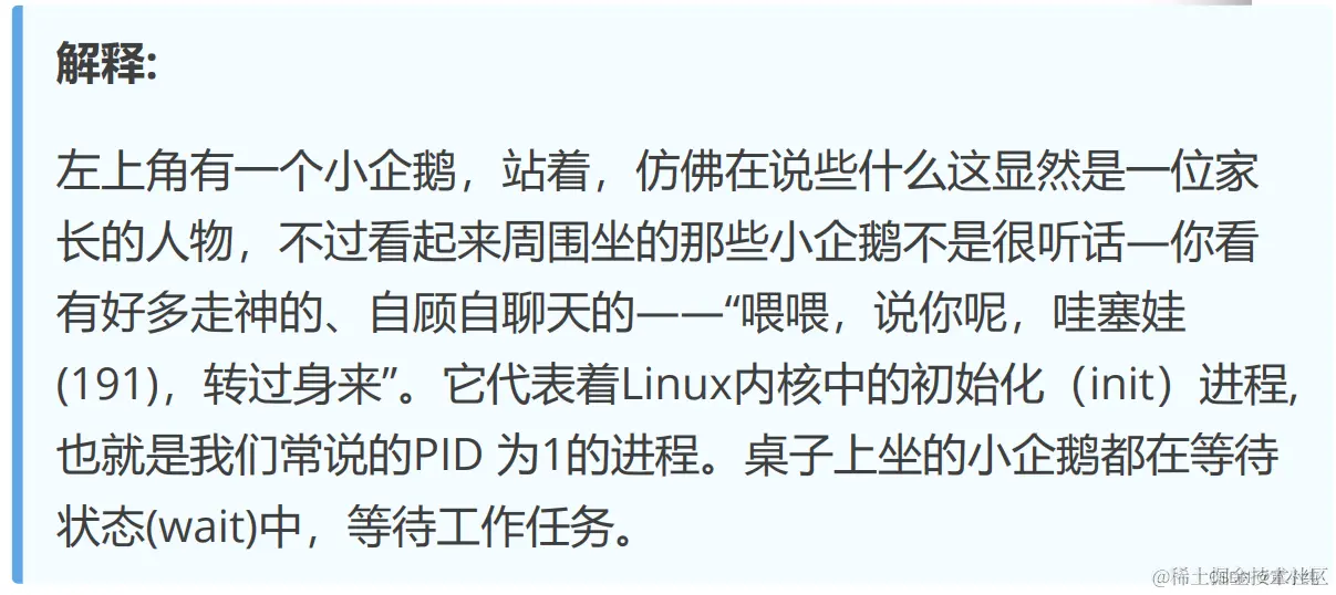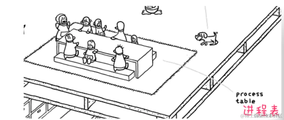 地基(底层)由一排排的文件柜组成,然有序,文件柜里放置 着“文件”—电脑中的文件。左上角,有一只胸前挂着421号牌的 小企鹅,它表示着PID (进程ID(Process ID) )为421的进程、它正在查看文件柜中的文件,这代表系统中正有一个进程在访问 文件系统。在右下角有一只小狗,它是看门狗(watchdog) 、这代表对文件系统的监控。