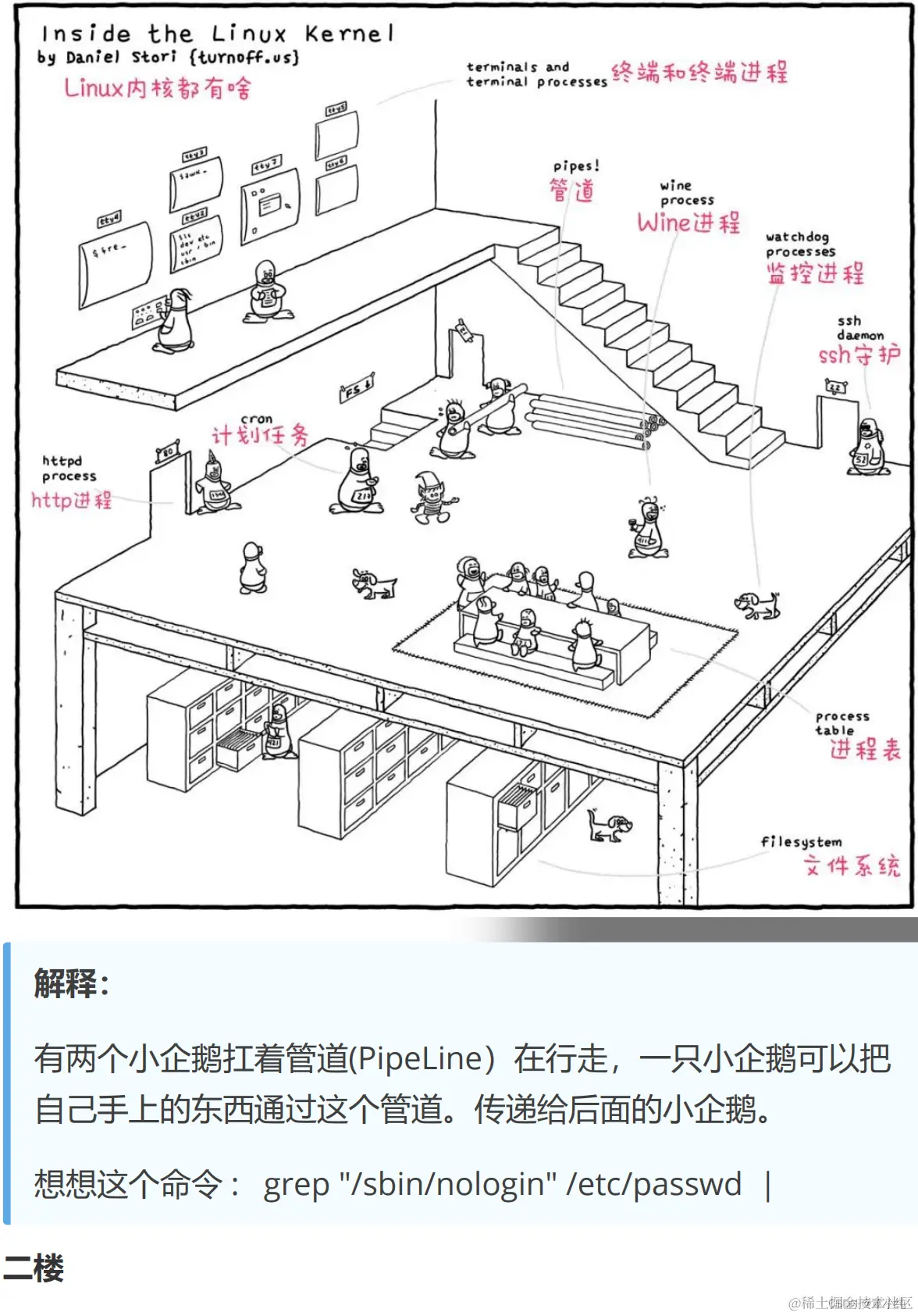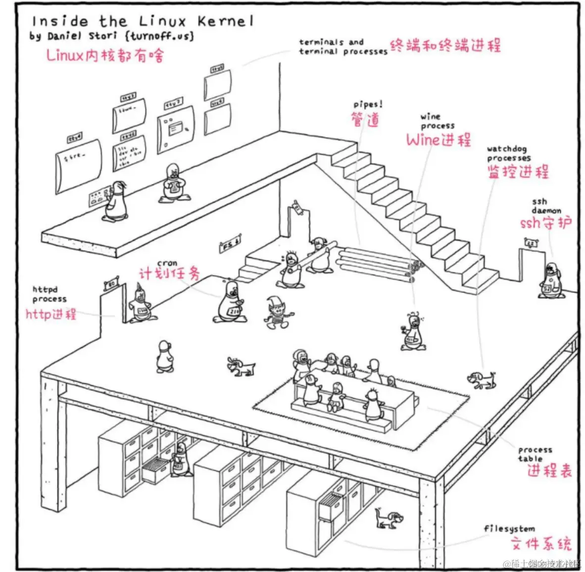 今天为大家解读一副来自极客漫画网站作者Daniel Stori关于Linux 有趣的作品。