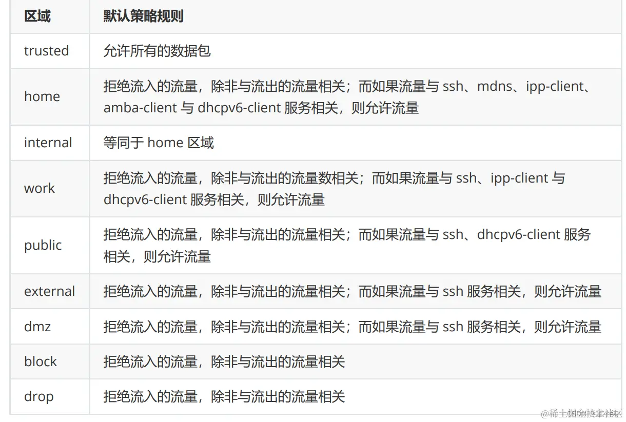 firewalld 中常用的区域名称及测了规则
