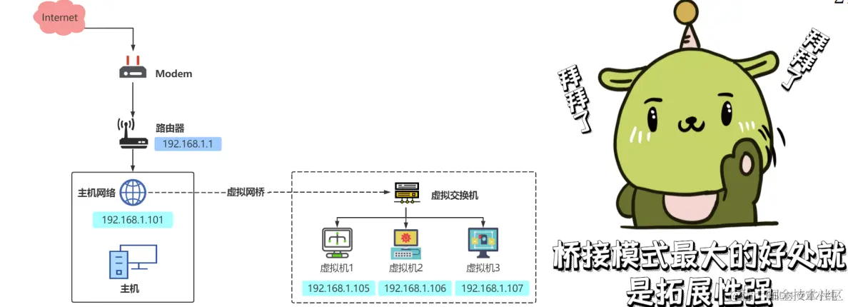 相当于在物理主机与虚拟机网卡之间架设了一座桥梁,从而可以通过物理主机的网卡访问外网。