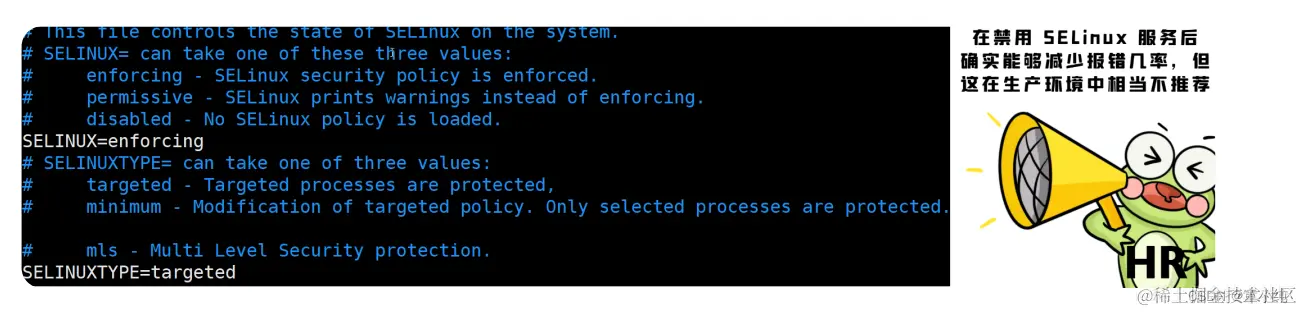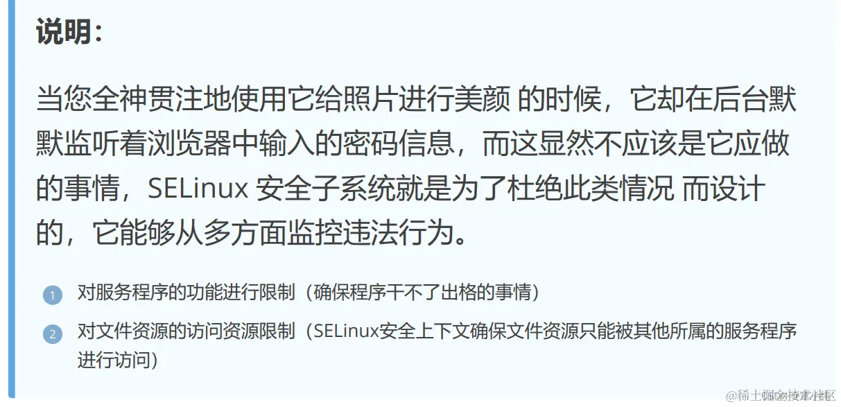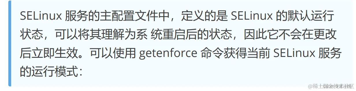 安全增强型 Linux(Security-Enhanced Linux)简称 SELinux,它 是一个 Linux 内核模块,也是 Linux 的一个安全子系统。