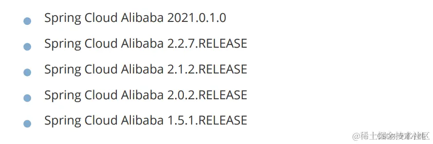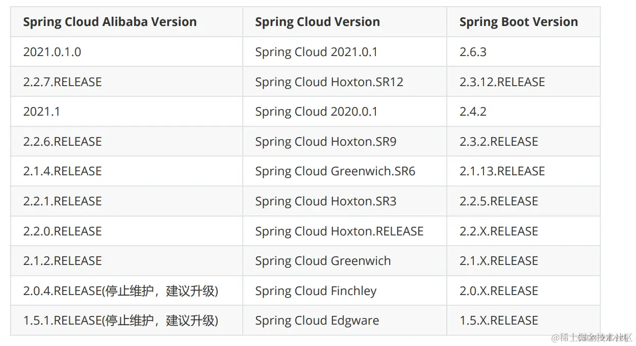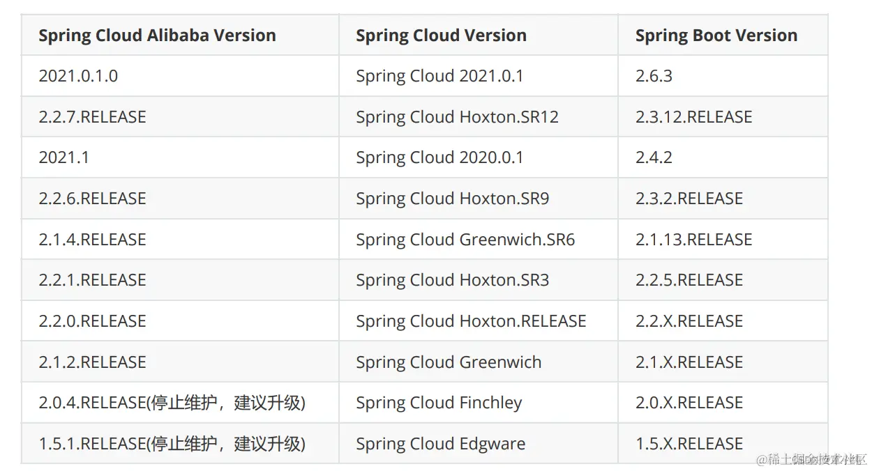 下表为按时间顺序发布的 Spring Cloud Alibaba 以及对应的适配 Spring Cloud 和 Spring Boot 版本关系(由于 Spring Cloud 版本 命名有调整,所以对应的 Spring Cloud Alibaba 版本号也做了对应 变化)