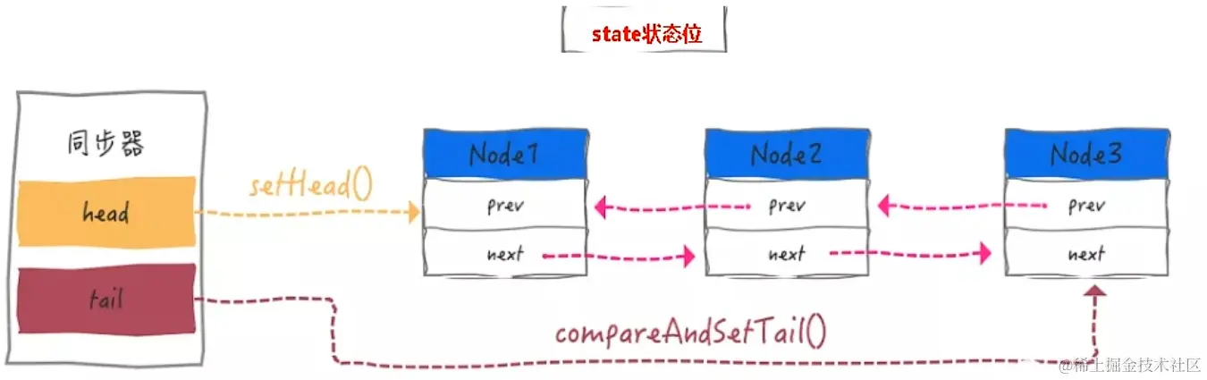 state标识是否阻塞。有阻塞就要排队,排队就要队列,使用双向链表的CLH,tail和head指针标识头和尾。