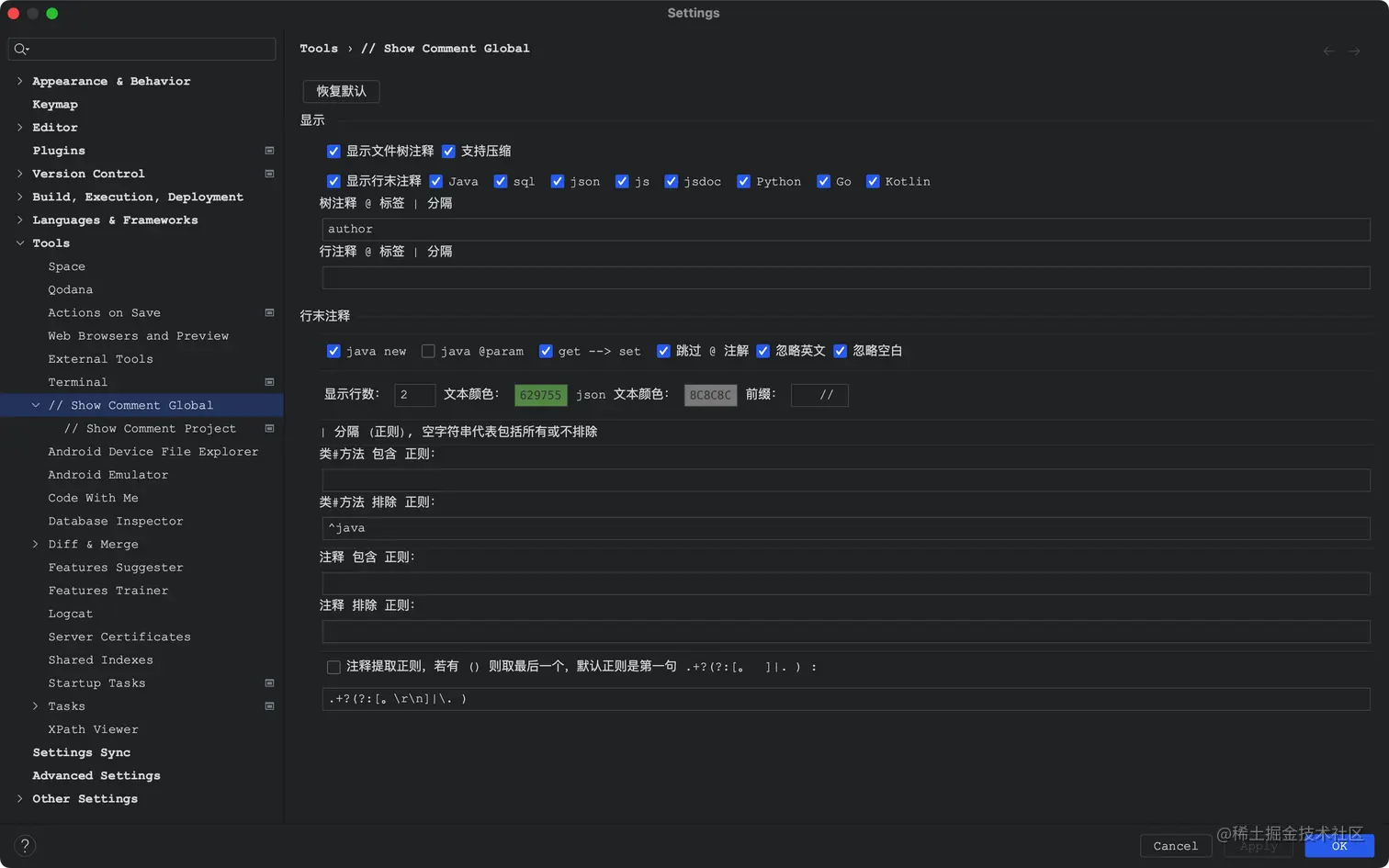 - 修改配置:设置 -> 工具 -> // Show Comment Global/Project;