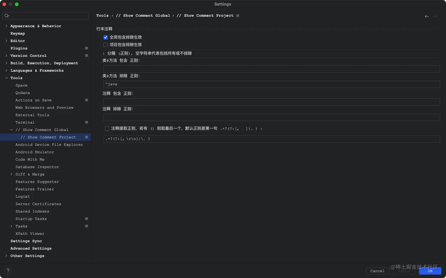 也可对项目注释是否展示进行配置,配置包含正则和排除正则表达式。