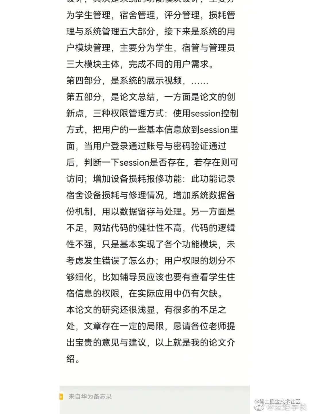 第五部分,是论文总结,一方面是论文的创新点,三种权限管理方式:使用session控制方式,把用户的一些基本信息放到session里面,当用户登录通过账号与密码验证通过后,判断一下session是否存在,若存在则可访问;增加设备损耗报修功能:此功能记录宿舍设备损耗与修理情况,增加系统数据备份机制,用以数据留存与处理。另一方面是不足,网站代码的健壮性不高,代码的逻辑性不强,只是基本实现了各个功能模块