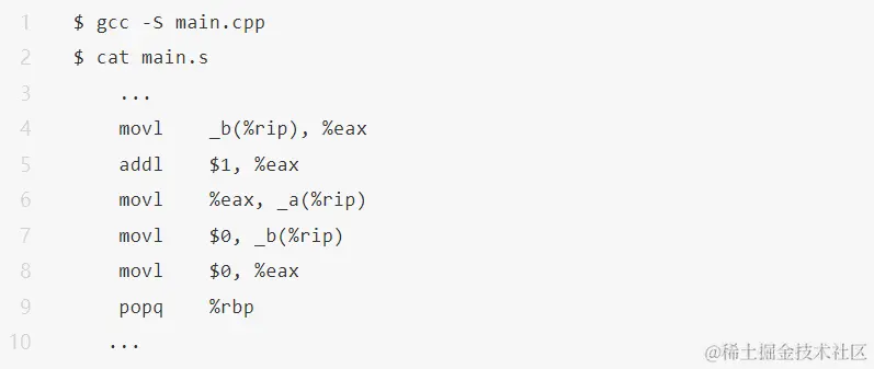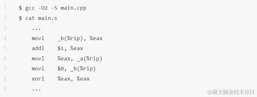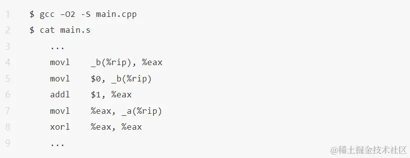如果想要整体开启优化,但是对于部分代码不想要重排,那么就可以使用 Compiler Barrier,在 gcc 里,asm volatile("" ::: “memory”)就是这么一个 Compiler Barrier。在使用 Compiler Barrier 后,使用使用 gcc 4.9.4 整体开启优化进行编译,得到汇编代码如下: