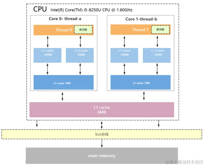 CPU 发展早期阶段,性能的提升主要来自于主频的提升和架构的优化,当这条优化途径出现瓶颈后,多核 CPU 开始流行起来。多核心同时执行任务极大地提高了系统整体性能,但也对硬件架构和软件编写提出了更大的挑战。各个核心都有自己的 Cache,以及不同层级的 Cache,彼此共享内存。一个典型的多核 CUP 架构如下图所示:
