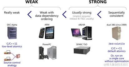 Memory Model 既有软件层面的 Software Memory Model,又有硬件平台的 Hardware Memory Model,下图中是几种 CPU 架构下的 Hardware Memory Model。