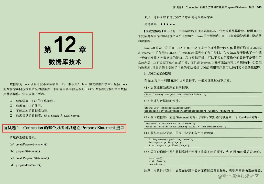 第12章数据库技术本章介绍了JDBC的工作机制、JDBC的使用、基本的数据库知识和常见的数据库(Oracle和SQLServer)。数据库是Java项目开发不可或缺的工具。求职者需要掌握基本的JDBC、数据库技术和常用的数据库基本操作。