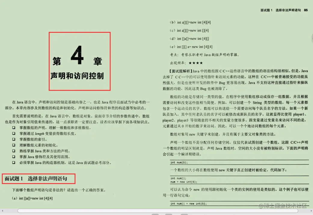 第4章声明和访问控制本章介绍了一维数组和多维数组、获得数组长度、数组索引、数组元素的初始化、Java类和方法的声明、Java 修饰符、Java 的构造器机制等。在Java语言中,声明和访问控制是基础内容之一, 也是Java 程序员面试当中必考的 部分。