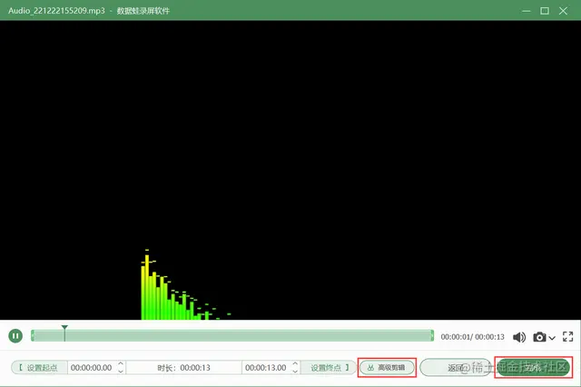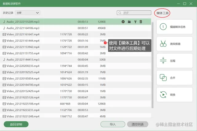 **步骤4.**录制完成后,可以在预览窗口,检查录音是否完整,还可以对录音文件进行剪辑或者高级剪辑。接着点击【完成】按钮,进入【录制历史】页面,在此页面可以使用【媒体工具】对文件进行后期处理。