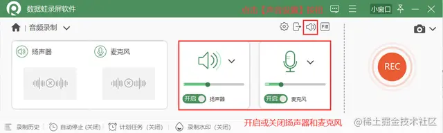 **步骤3.**点击软件主界面的【音频录制】模式,进入【音频录制】页面。在此页面您可以开启或关闭扬声器和麦克风。录制内部声音时,仅开启扬声器即可;录制外部声音时,仅开启麦克风即可;同时录制内部声音和外部声音,需要同时开启扬声器和麦克风。接着点击【REC】按钮进行录制。