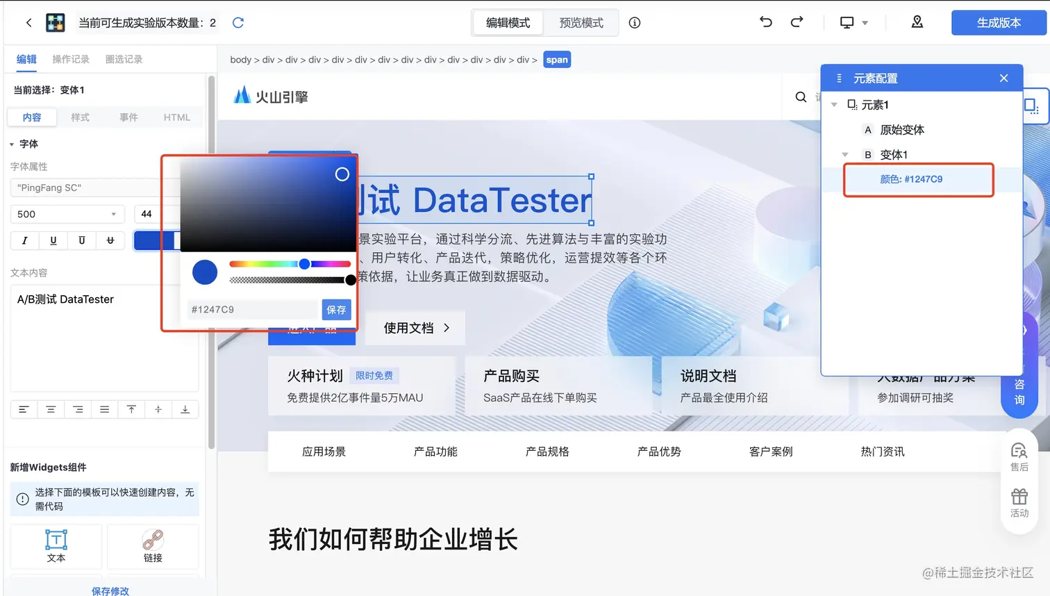 在DataTester中选择变体之后,左侧看板联动,显示当前对应的元素和变体,便于用户直接对选中元素进行编辑。如下图所示,支持可视化编辑元素文本、颜色、字体、样式等。