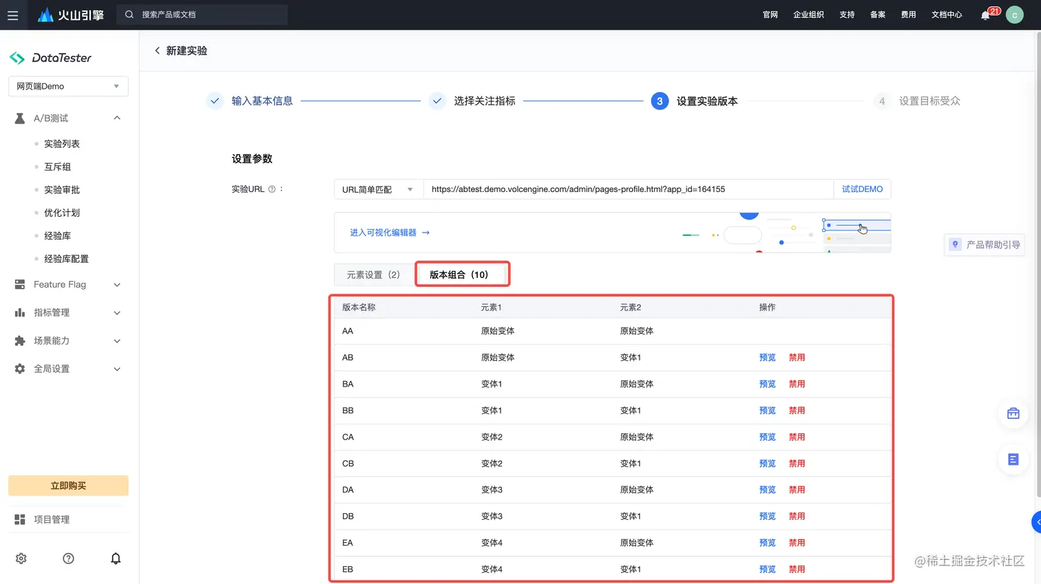 据介绍,多变体可视化实验中的元素(Element),指的是页面中的元素,如页面按钮位置、样式、颜色等,DataTeater支持针对页面中的多个元素进行A/B实验。变体(variant)是针对页面元素中的修改,元素进行修改内容和样式保存之后就是变体。而组合(combination)则是指实验组,即一个元素下可以有多个变体,一个变体下有同一个元素不同修改,元素中不同的变体相互交叉组成的一个版本。