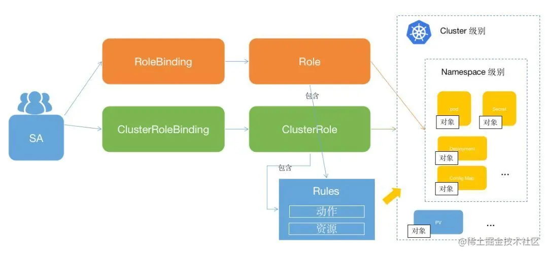 RoleBinding 或者 ClusterRoleBinding 可绑定角色到某 主体(Subject) 上。主体可以是组,用户或者服务账户。