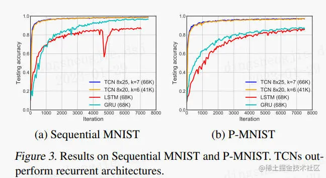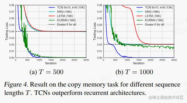 总体来讲,TCN模型上的创新并不是很大,因果卷积和扩展卷积也并不是本论文提出来,本文主要是将TCN的结构梳理了一下,相比于wavenet中的结构,去掉了门机制,加入了残差结构,并在很多的序列问题上进行了实验。实验效果如下: