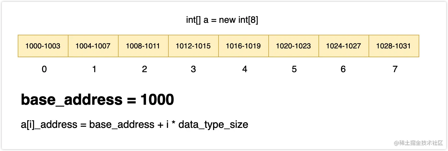 如上图,新建一个8个元素的数组,即有一块连续的内存空间来存放这8个元素,假设内存块的首地址base_address = 1000,则每个元素的地址如图所示。
