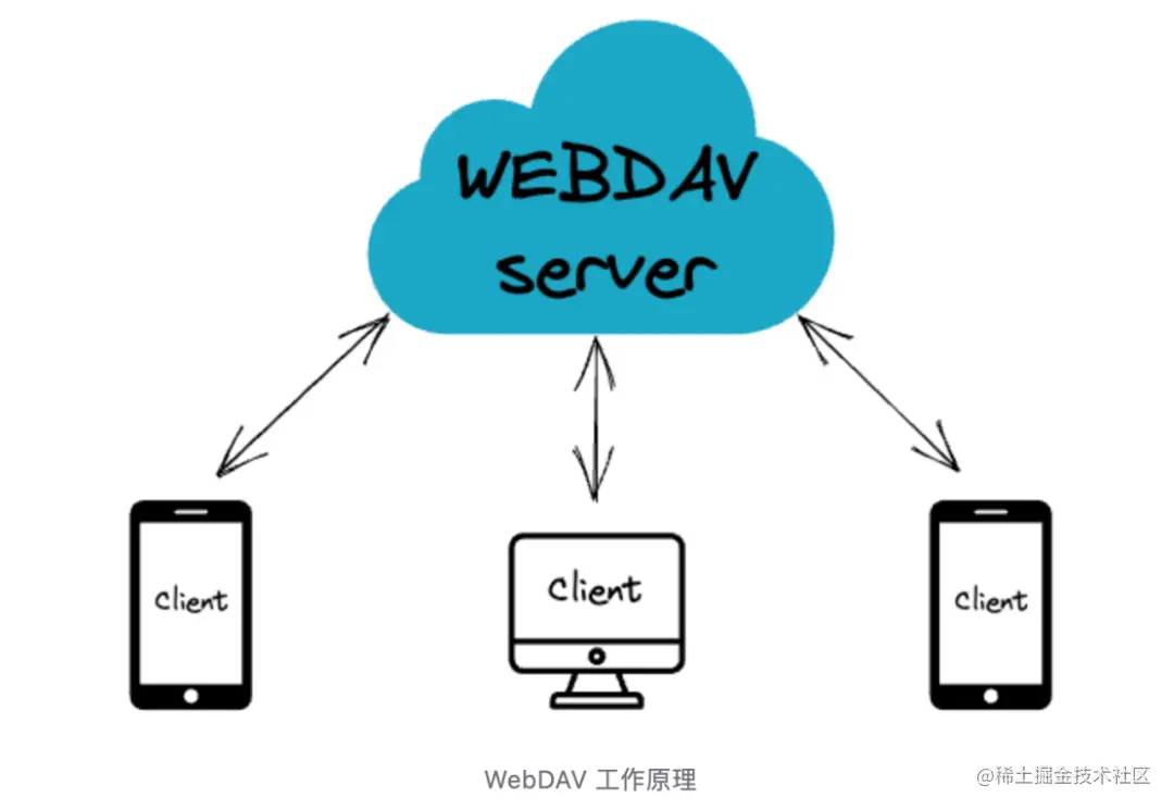 - WebDAV 服务器:蓝色云朵代表 WebDAV 服务器,用来响应客户端的连接和读写请求,存储数据。