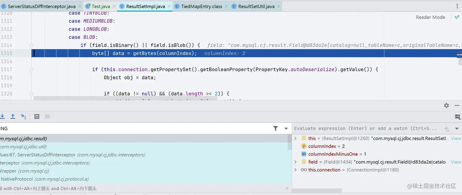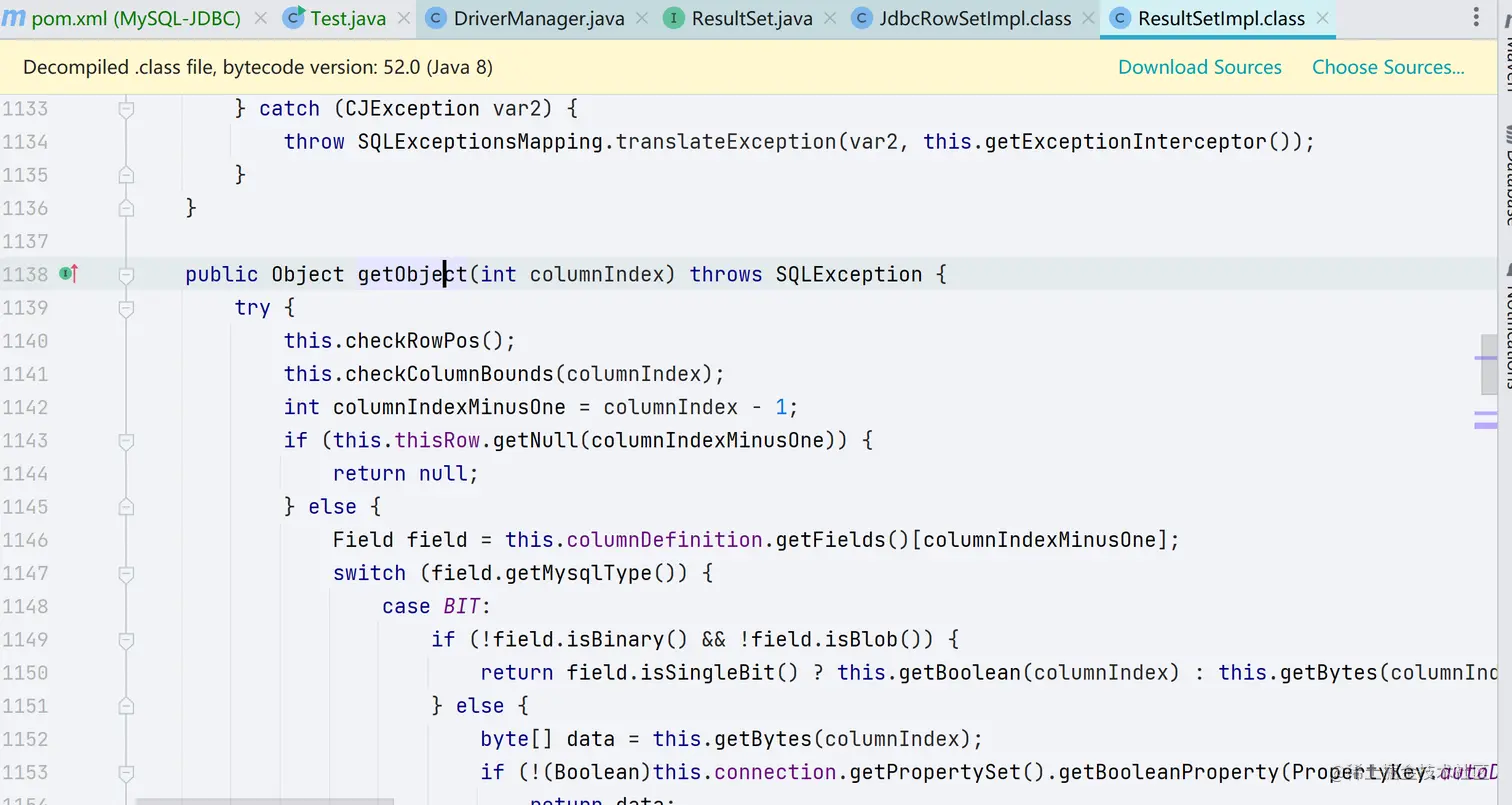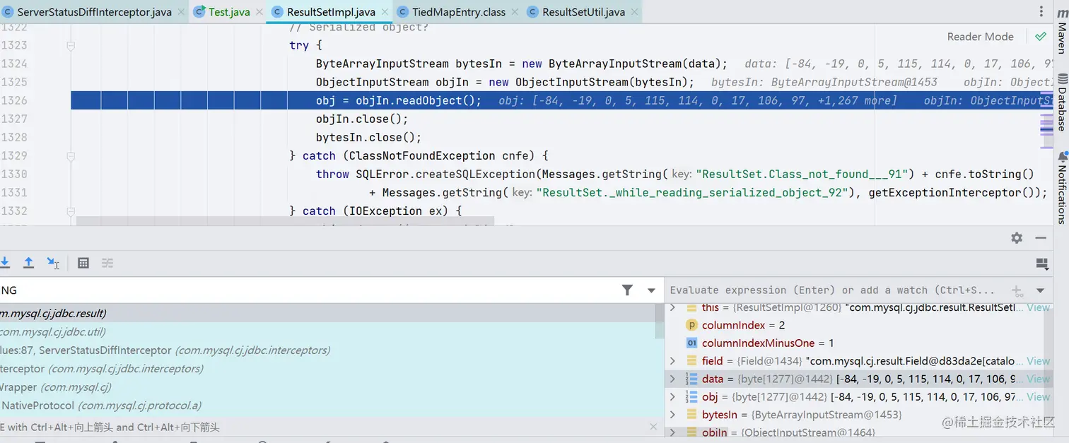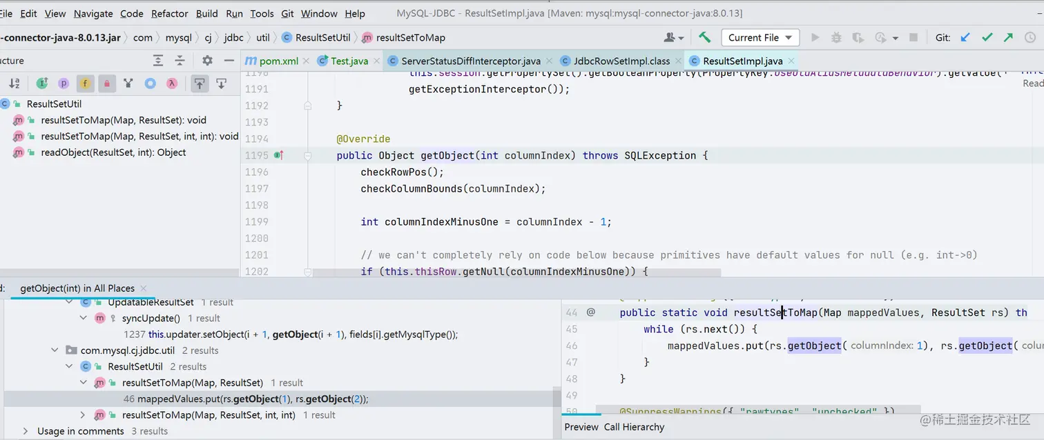 CC 链作为命令执行的部分,也就是说需要我们找一个 JDBC 合理的入口类,并且这个入口类需要在 JDBC 连接过程中被自动执行,最终是找到了这样一个类 com.mysql.cj.jdbc.result.ResultSetImpl,它的 getObject() 方法调用了 readObject() 方法