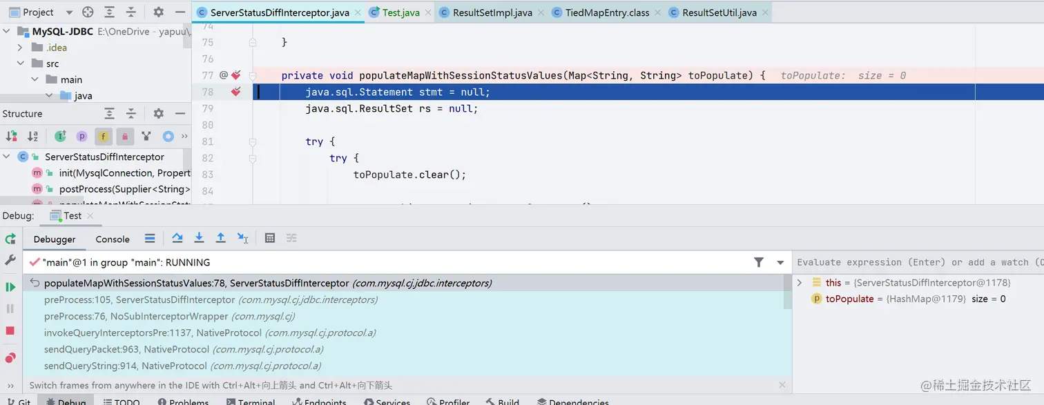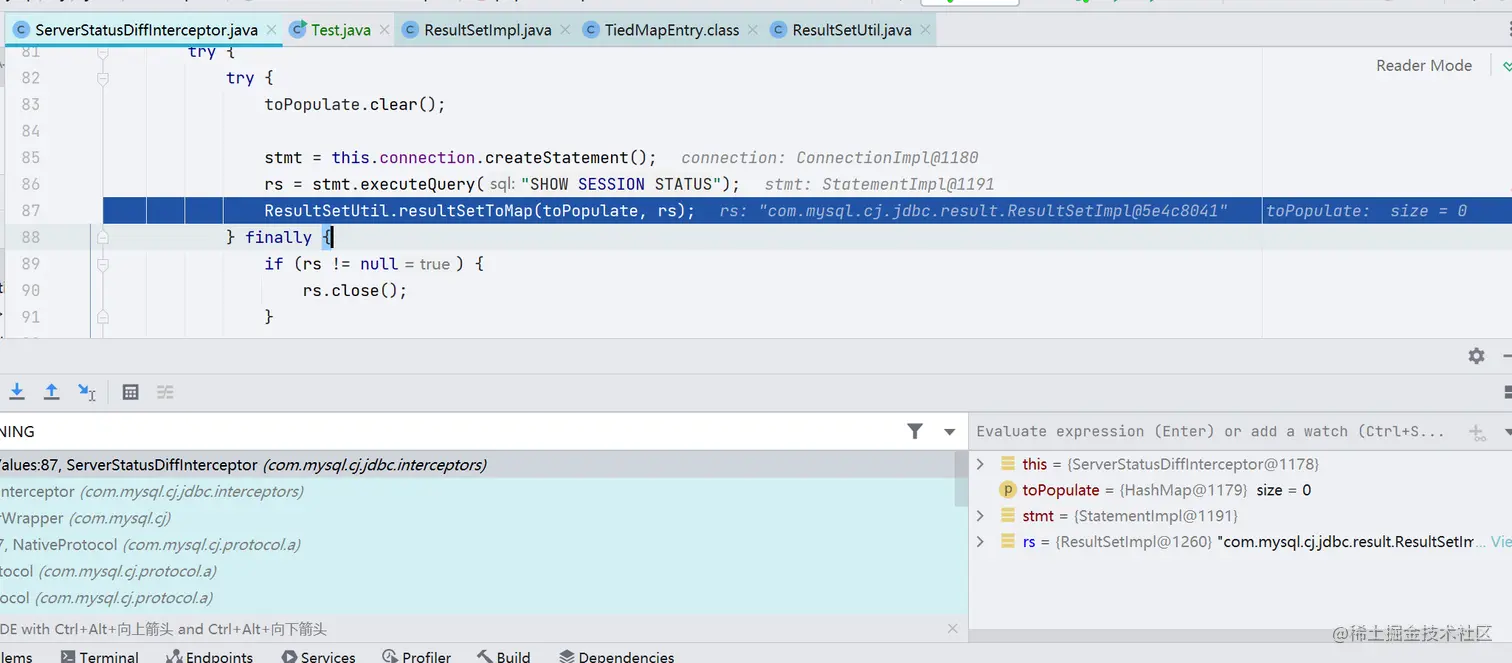 在 com.mysql.cj.jdbc.interceptors.ServerStatusDiffInterceptor#populateMapWithSessionStatusValues 下个断点,开始调试分析