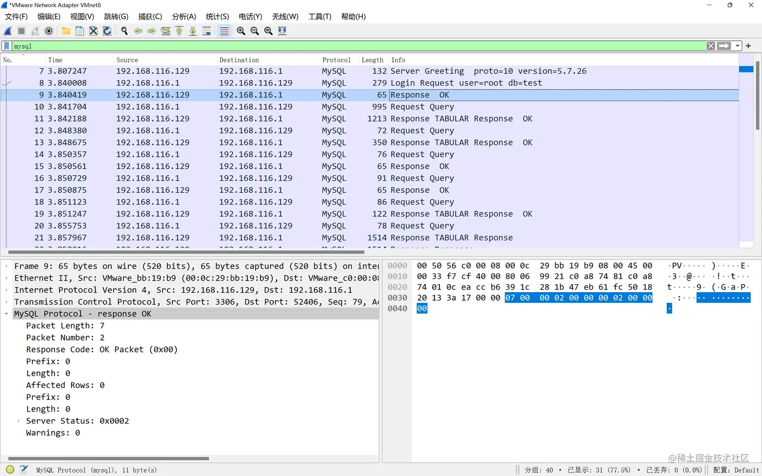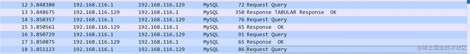 通过 tcp.port == 3306 && mysql 来过滤协议