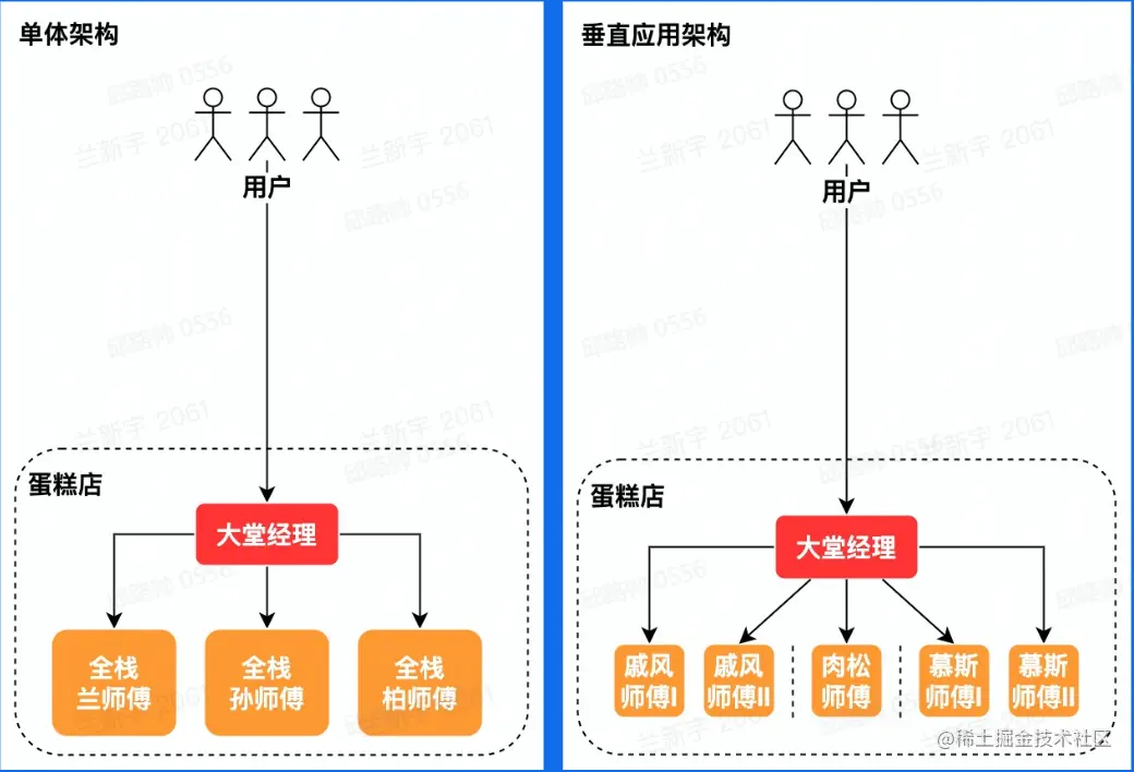 单体架构:分布式部署;垂直应用架构:按应用垂直切分的单体;