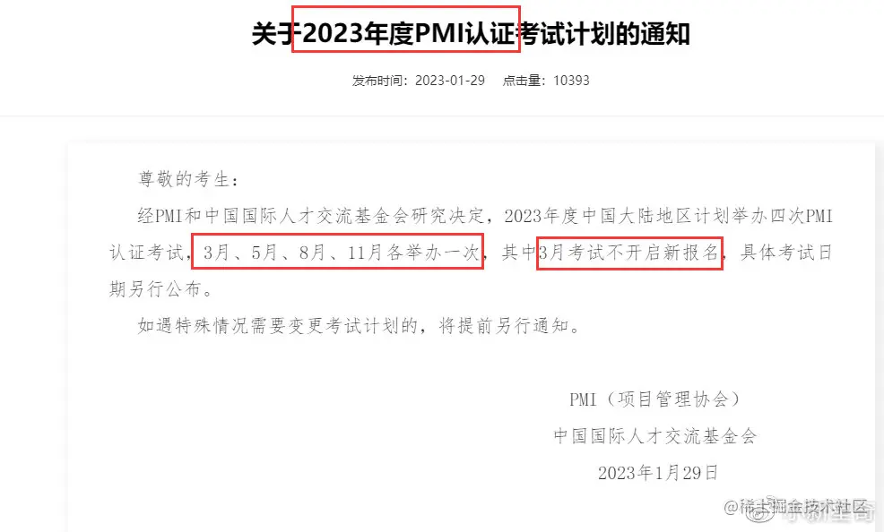 关于2023年度PMI认证考试计划的通知 西西梨 2023-02-01 70 阅读1分钟 尊敬的考生: 经PMI和中国国际人才交流基金会研究决定,2023年度中国大陆地区计划举办四次PMI认证考试,3月、5月、8月、11月各举办一次,其中3月考试不开启新报名,具体考试日期另行公布。 如遇特殊情况需要变更考试计划的,将提前另行通知。 PMI(项目管理协会) 中国国际人才交流基金会 2023年1月29日