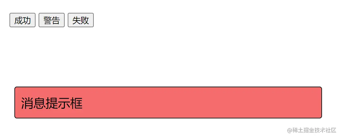 这个例子中,我们有几个简单元素:三个按钮和一个消息提示框。需求是,我需要在点击成功按钮时,将提示框的背景色设置为绿色,点击警告按钮时,将背景色设置为黄色,失败时就是红色,这里我通过点击按钮时,切换消息提示框的class来实现简单的html代码如下: